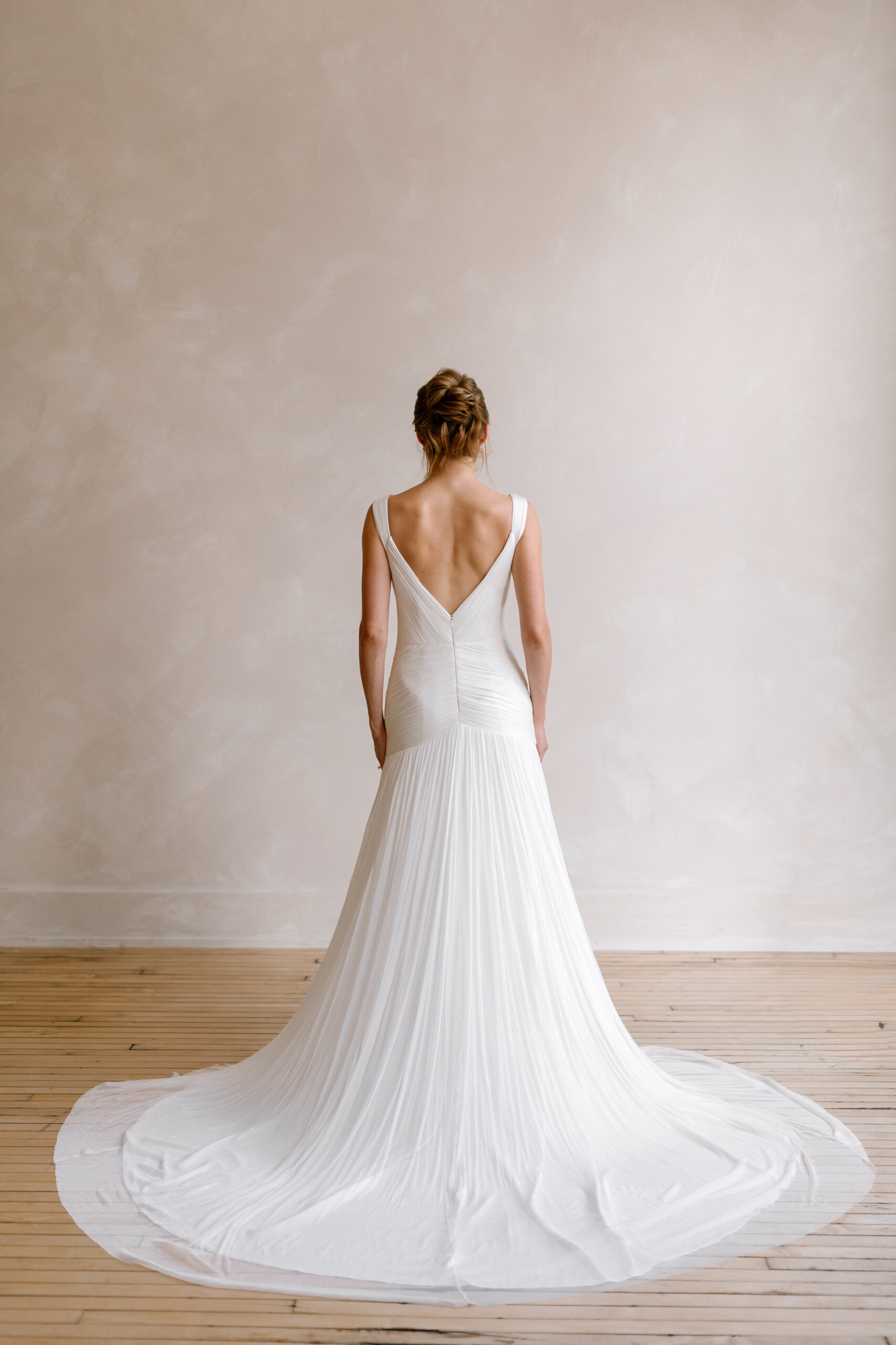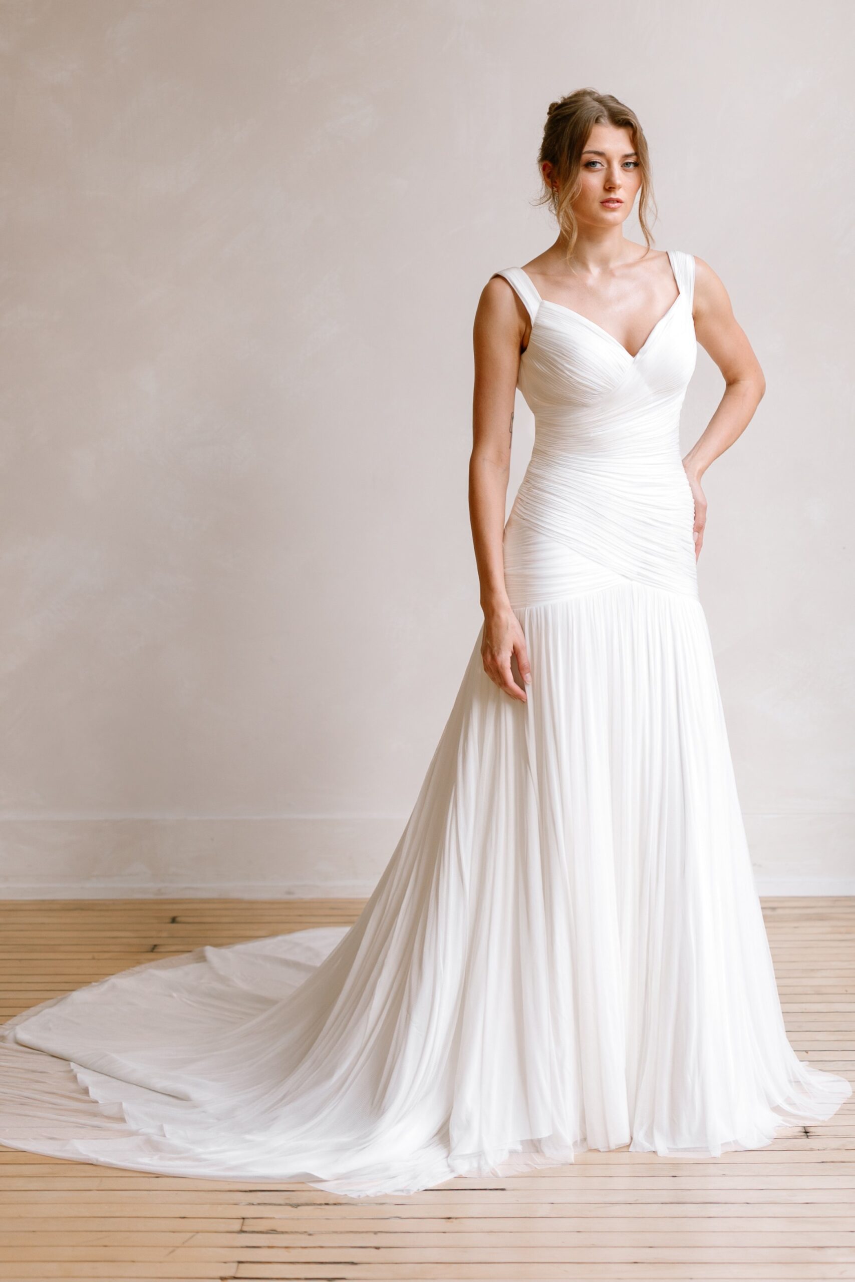 - hand-draped bodice with soft drop waist