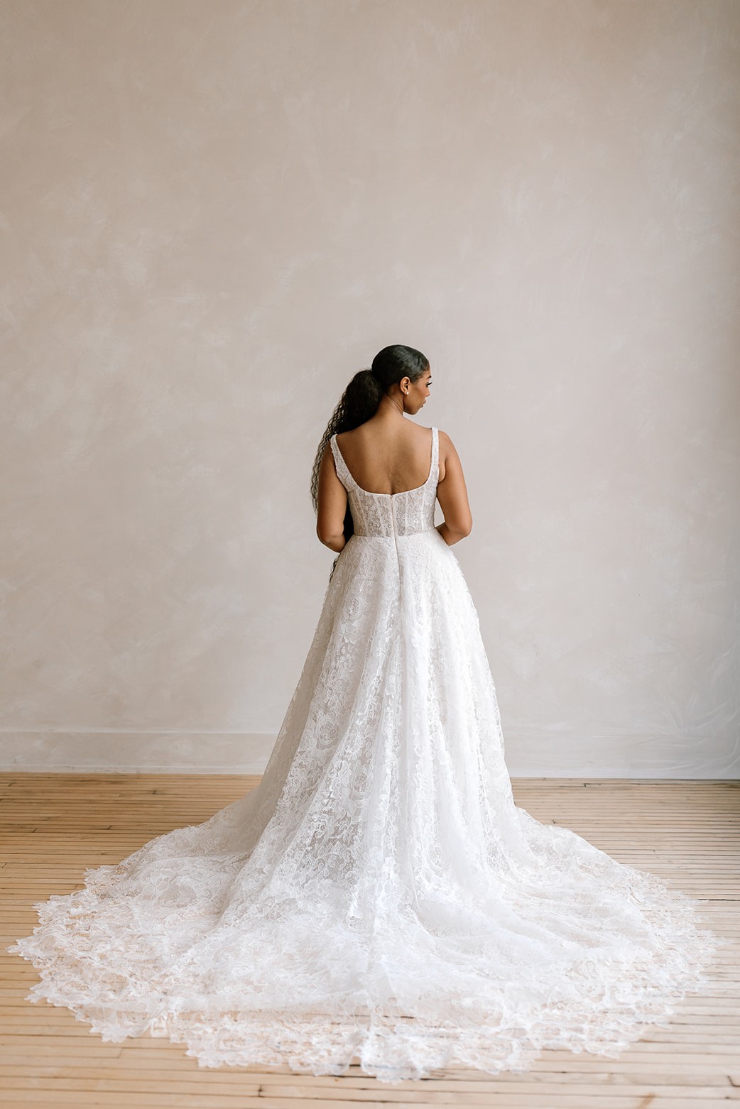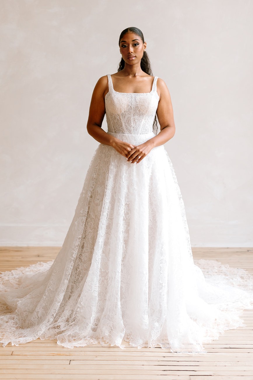 Square neck, A-line lace wedding dress. Parker is classic and her lace is subtle and fresh.