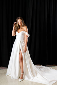 September 10, 2025 by Cindy Leave a Comment Arabella Satin Off the shoulder wedding dress Grace and Ivory 7